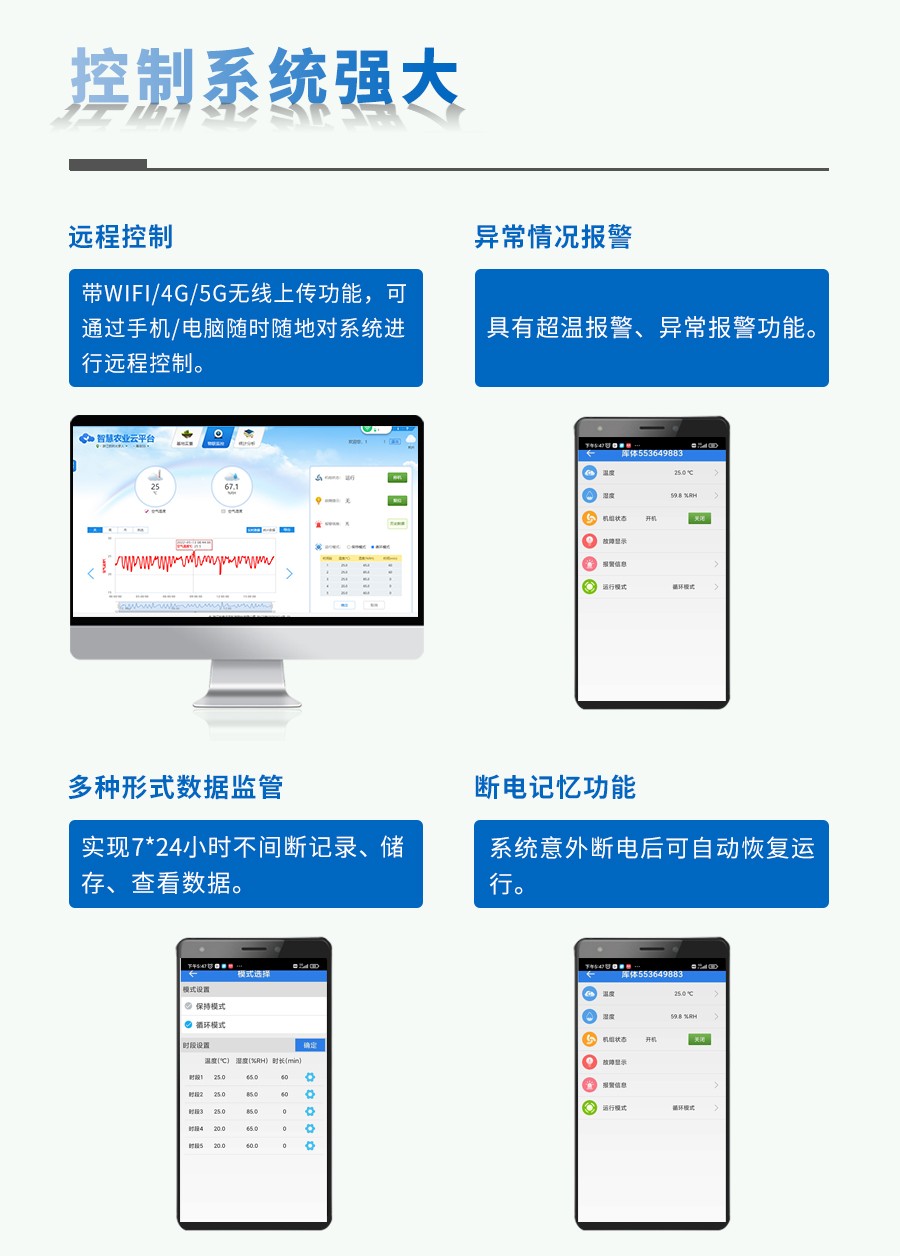 2、遠程控制:帶WIFI/4G/5G無線上傳功能,無論在何時何地只要能上網即可通過手機和電腦遠程對溫濕度、光照數據進行查看,數據存儲云端不丟失;遠程復位、緊急開關機。